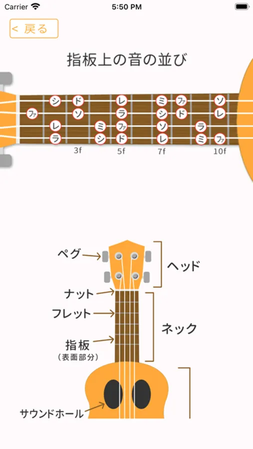 各パーツの名前からウクレレで使用する奏法の名前まで基本用語の説明。