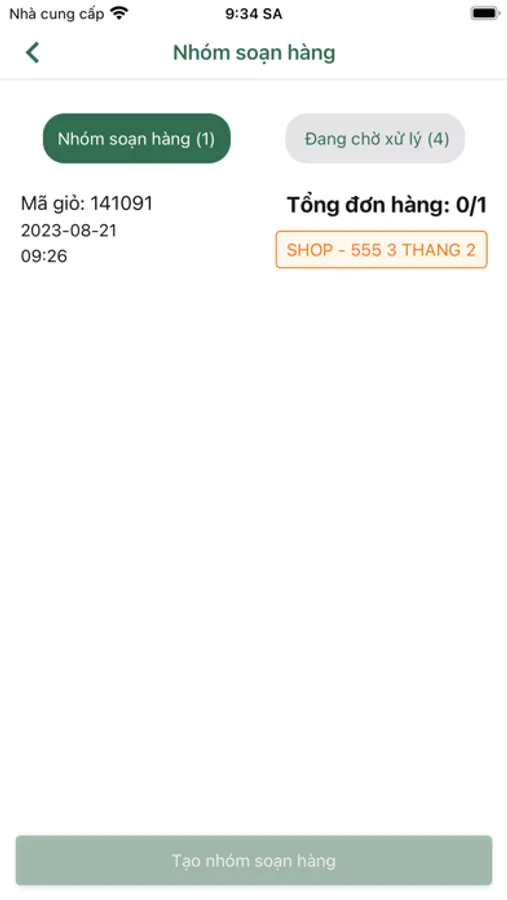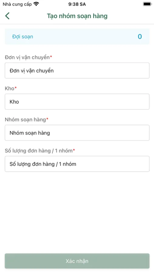 Màn hình 2: Tùy chọn tạo nhóm soạn bao gồm đơn vị vận chuyển, kho cần lấy hàng, chia bao nhiêu nhóm soạn hàng và số đơn trên 1 nhóm soạn hàng → Nhấn xác nhận để tạo nhóm
