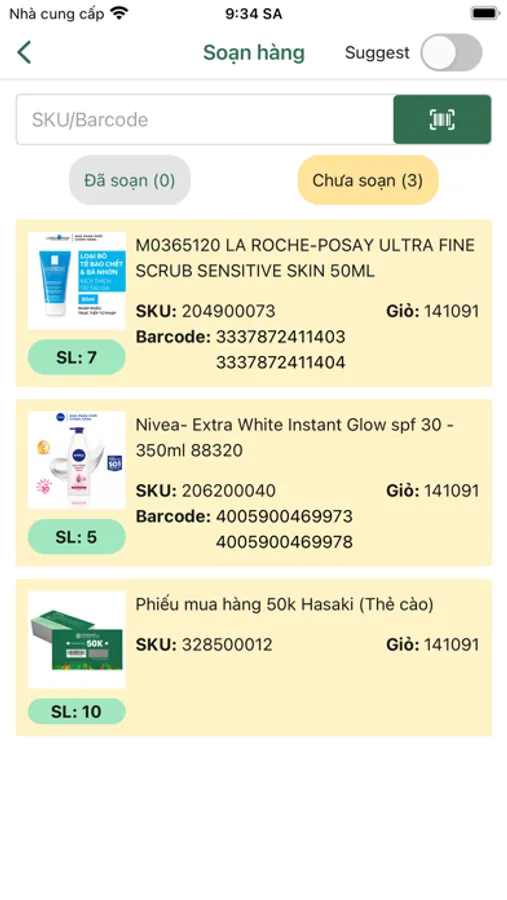 Bước 4: Click vào đơn hàng để đóng gói đơn hàng bao gồm số lượng và mã sản phẩm cho đơn hàng. Sau khi nhập hoặc scan đủ đơn bấm "xác nhận" đơn hàng sẽ hoàn tất và tạo ra barcode để bạn có thể scan và in liên để đóng đơn. Trong trường hợp đơn hàng thiếu bạn có thể bấm hết hàng và điền lí do để thông báo hết hàng cho hệ thống