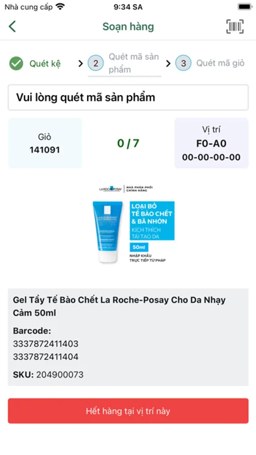 Màn hình 5: Chi tiết sản phẩm sẽ được lấy tại vị trí này bao gồm số lượng lấy tại vị trí này, mã giỏ đưa vào và mã kệ lấy sản phẩm ra. Khi bấm xác nhận thì hệ thống sẽ suggest vị trí với SKU kế tiếp cần lấy hàng (nếu chọn suggest switch được bật) hoặc sẽ đưa về lại màn hình danh sách sản phẩm để chọn lấy hàng kế tiếp (nếu suggest switch không bật - chế độ lấy ngẫu nhiên)