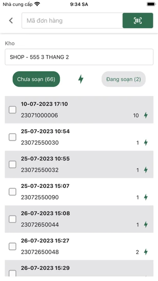 Bước 1: Chọn kho sẽ chọn đơn hàng, sau đó check chọn đơn hàng và xác nhận lấy hàng