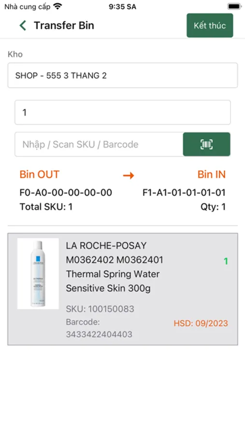 Bước 2: Nhập hoặc quét SKU muốn chuyển đổi vị trí với số lượng chuyển đổi vào kệ. Nếu như SKU được kiểm tra thành công hệ thống sẽ tự động chuyển kệ và thông báo thành công
