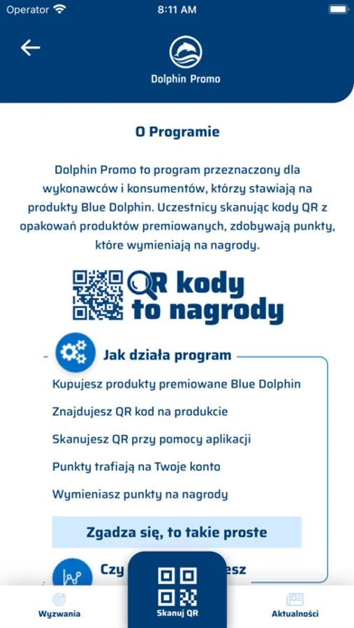 Aplikacja Dolphin Promo zapewni Ci dostęp do programu lojalnościowego QR KODY TO NAGRODY. Jako uczestnik programu będziesz skanować kody QR widoczne na wybranych produktach marki Blue Dolphin, co bezpośrednio przełoży się na zdobywane punkty. Te z kolei wymienisz na atrakcyjne  nagrody, zamawiając je w prosty sposób. Ponadto aplikacja Dolphin Promo oferuje Ci szereg dodatkowo punktowanych wyzwań, a także umożliwia sprawdzenie statusu w programie oraz stały dostęp do aktualności i informacji płynących od firmy Blue Dolphin.