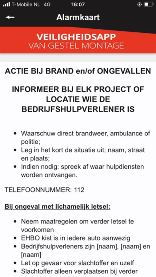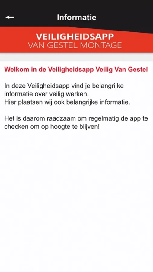 Dit is de Veiligheidsapp van Van Gestel Montage. Hierin staat alles over wat te doen bij onveilige situaties en kunnen onveilige situaties gemeld worden. Regelmatig wordt er nieuwe informatie over veilig werken in deze app geplaatst en er kunnen werkplek inspectie worden uitgevoerd.