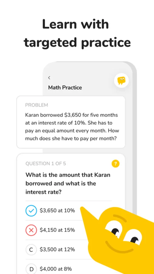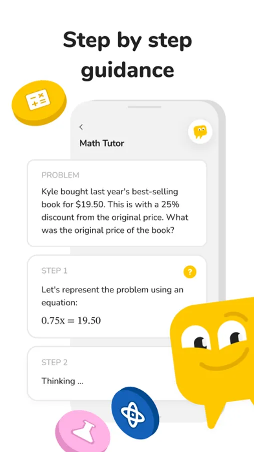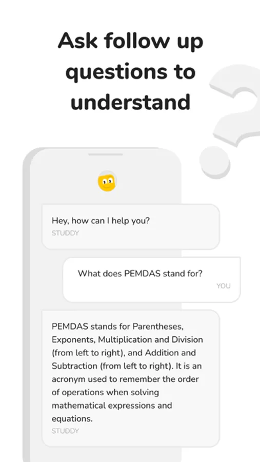You can chat with Studdy Buddy anytime you feel stuck, confused, or curious. Studdy has the context of what you're trying to solve in the app, so it can always help. Start a chat by clicking the Studdy icon, or get help with a particular problem step from Studdy by clicking the "?" on the solution step. Studdy has infinite patience, so you ask him as many questions as you'd like to learn any concept!
