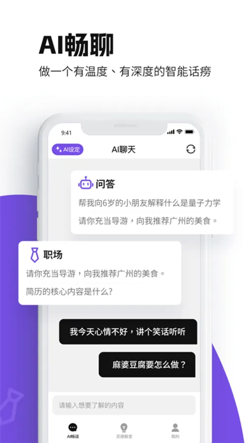 AI角色设定:通过对AI的设定,让AI变成您创建出来的独一无二的角色,它可以倾听您的想法并根据您的设定给出回答,也可以变成您想成为的角色与您互动;