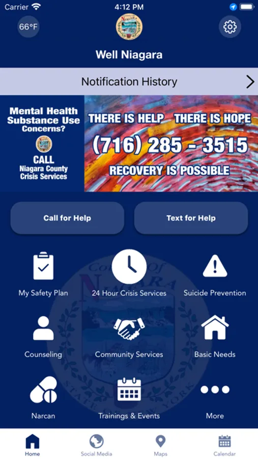 The Well Niagara app is created for Niagara County, NY residents to increase awareness of and to connect / stay connected to a variety of resources that can assist with improving and sustaining mental, emotional, behavioral and physical wellness. For those struggling with mental health and /or substance use related concerns, calling Niagara County Crisis Services 24-Hour Phone line at 716-285-3515 or 9-8-8, or texting Got5 to 741741, can help with obtaining immediate assistance and support on a 24/7 basis. Individuals and their loved ones can better understand the signs of risk behaviors and warning signs and find important resources that will help them to make informed decisions. Create your own safety plan with actionable steps for harm reduction. Suicide awareness and prevention and locating an array of local supports, services and treatment options, are a main focus of the app as well as finding peace and calm in the midst of stressful and anxiety-provoking situations. Information on Narcan and training on its use in emergency situations along with other harm-reduction options and resources are included. In case of an emergency, call 9-1-1.