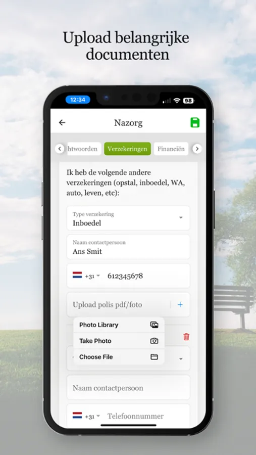 * Verzekeringen: verzekeraar, adviseur, contactpersoon, telefoon en website + inloggegevens, uploaden polis