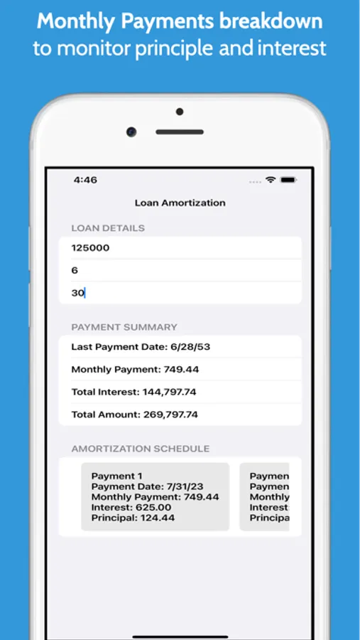 2. Amortization Schedule: In addition to the monthly payment, the app generates an amortization schedule, showing a detailed breakdown of each monthly payment, including how much goes towards principal and how much towards interest. Users can use this schedule to track their loan repayment progress over time.