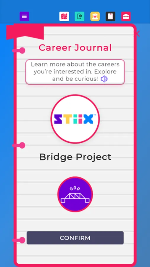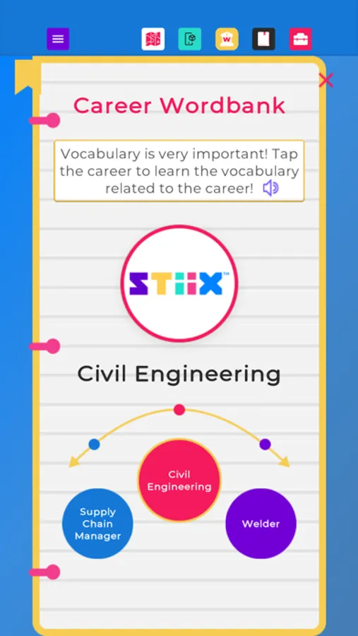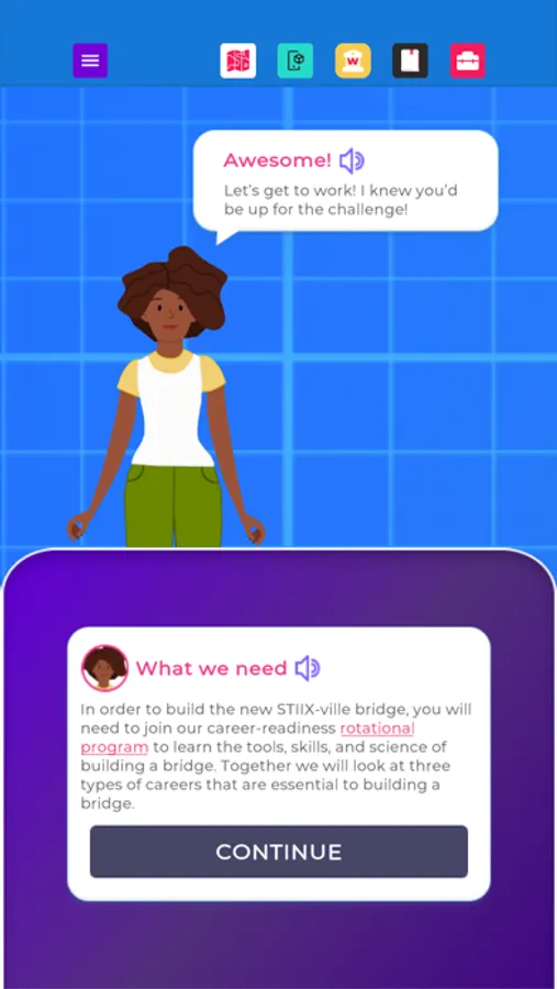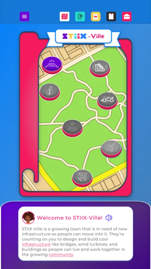 Welcome to STIIX-ville! Throughout this application, you will be immersed as an engineering apprentice to learn about STEM education as well as all kinds of careers related to engineering and other technical professions. Choose from our diverse selection of mentors to guide you around the modules, bring tools to life in augmented reality, and complete engaging activities to sharpen your career skills. Upon completion, you will become STIIX-ville's Chief Engineer to ensure the town has all the required infrastructure for future growth and expansion, plus a personalized Career Journal!