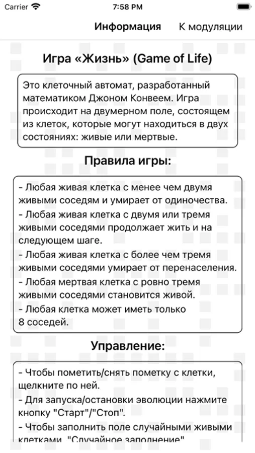 На стартовом экране можно ознакомиться с правилами, а при нажатии "К модуляции" перейти к самой игре.