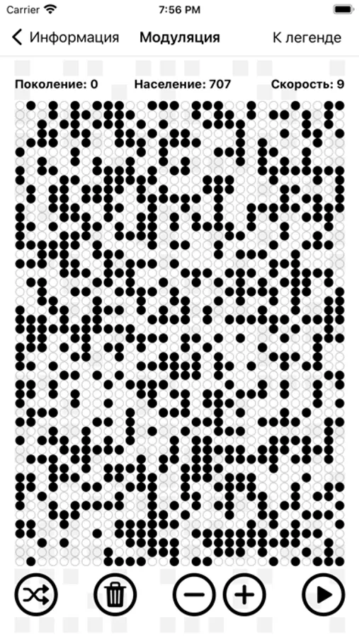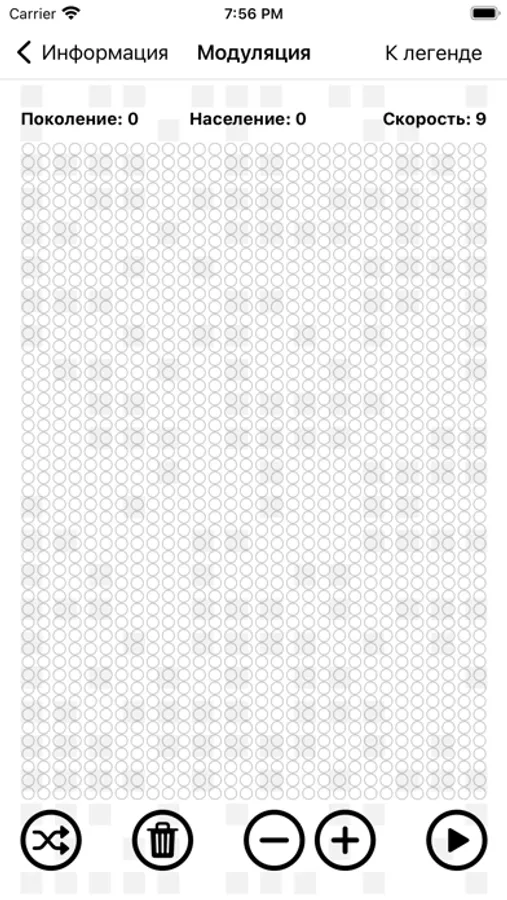 Для управления скоростью эволюции используйте кнопки "Плюс" и "Минус".