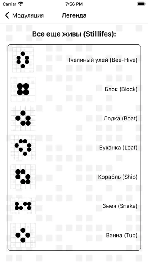 При нажатии на кнопку "К легенде", можно ознакомится с основными фигурами из живых клеток которые могут встретиться в игре.