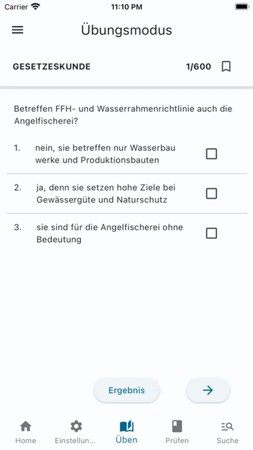 - Übungsmodus: Wähle eine Kategorie und beantworte nacheinander verschiedene Fragen. Deine Antworten werden gespeichert, so dass du später gezielt offene, richtig oder falsch beantwortete Fragen üben kannst. Du hast auch die Möglichkeit, die Reihenfolge der Fragen zu ändern oder deinen Fortschritt zurückzusetzen.