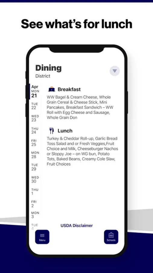 Within the dining section, you'll find an easy to navigate, weekly menu, sorted by day and meal type.