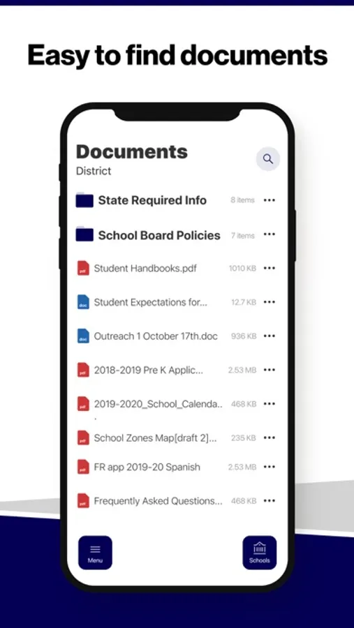 The event section shows a list of events throughout the district. Users can add an event to their calendar to share the event with friends and family with one tap.