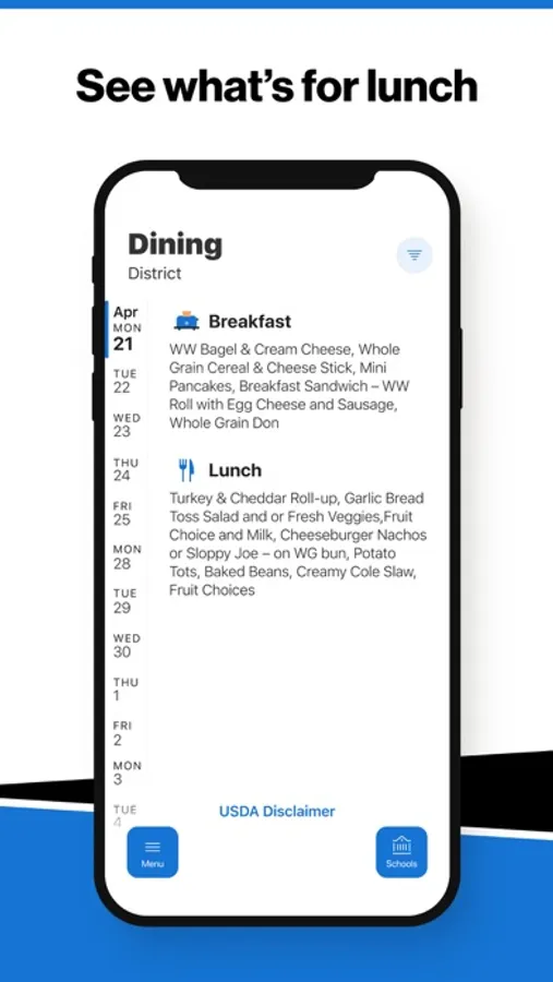 Within the dining section, you'll find an easy to navigate, weekly menu, sorted by day and meal type.