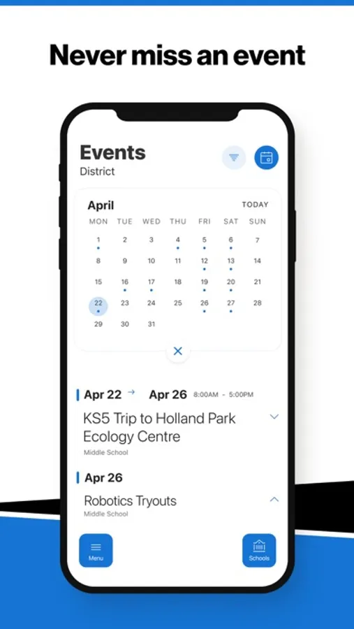 The event section shows a list of events throughout the district. Users can add an event to their calendar to share the event with friends and family with one tap.