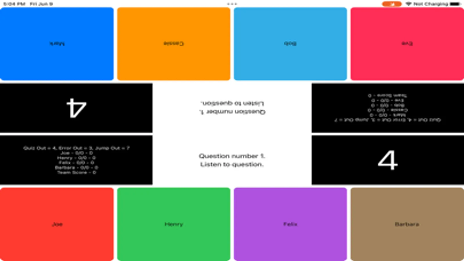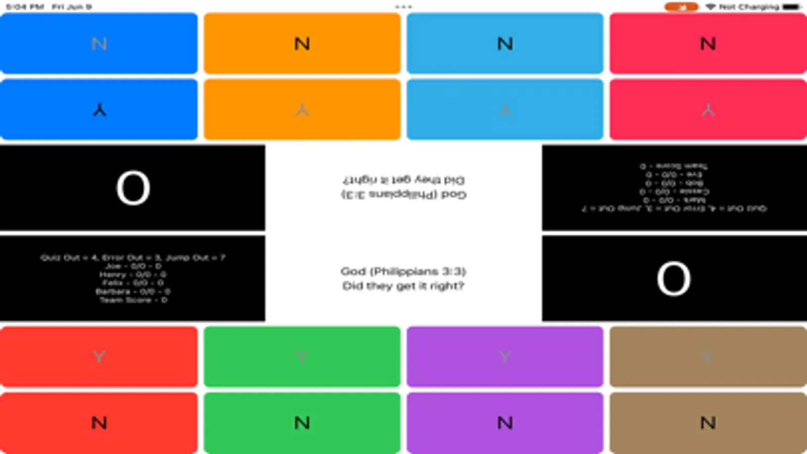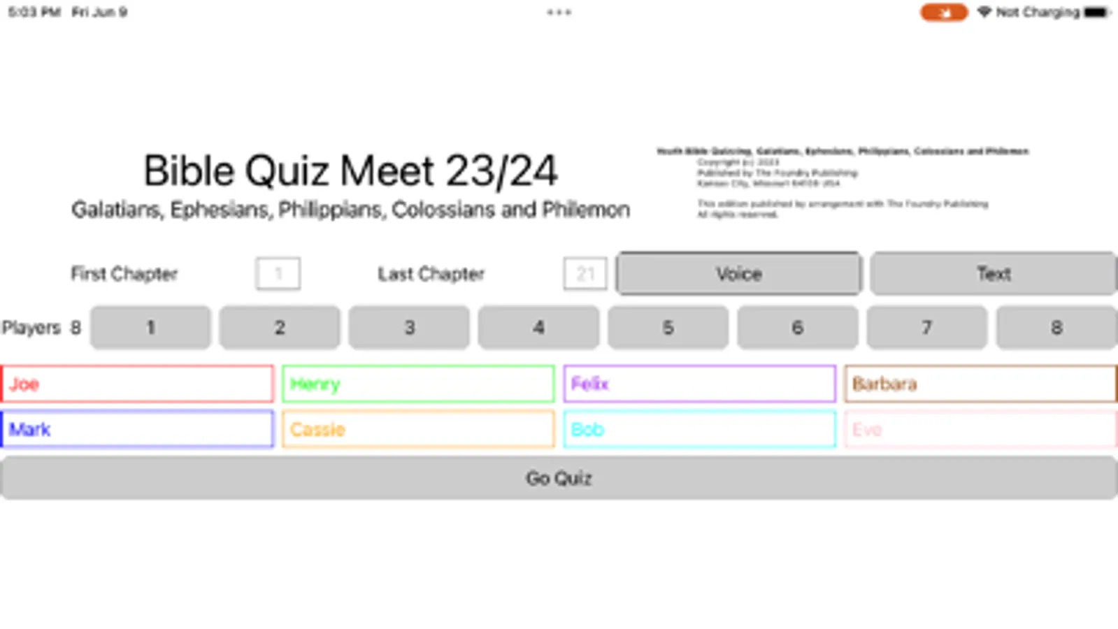 This app simulates an actual Youth Bible Quizzing meet. It allows up to 8 quizzers at one time. The quizzers can "jump" by pressing their button. It includes timers and points systems that match those used in official Nazarene Youth Bible Quizzing meets. The software "speaks" the question using text to speech software, and when a quizzer "jumps" they are expected to finish the question (if incomplete) and answer it. After they complete, (or after 30 seconds), the answer is revealed and the other quizzers can vote on whether the "jumper" was correct or not. Points are assigned as appropriate, following the official scoring system as well as can be.