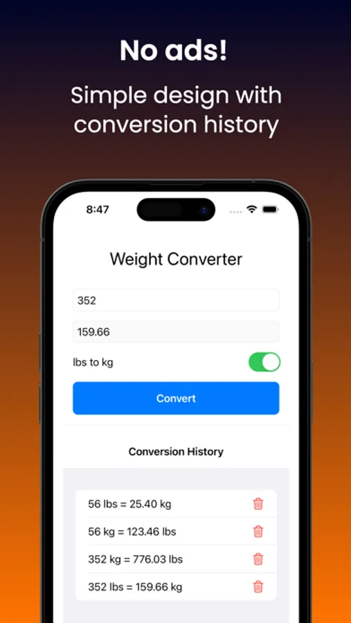 - Weight Converter: Instantly convert between pounds, kilograms, and grams. Perfect for weight-related calculations and conversions on the go.