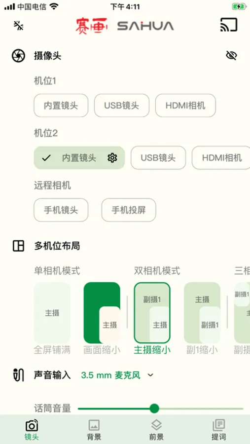 2,内置镜头/USB镜头/HDMI相机切换及其设置功能(包括旋转,镜像,绿幕抠图等),多机位布局切换,MIC 调节。
