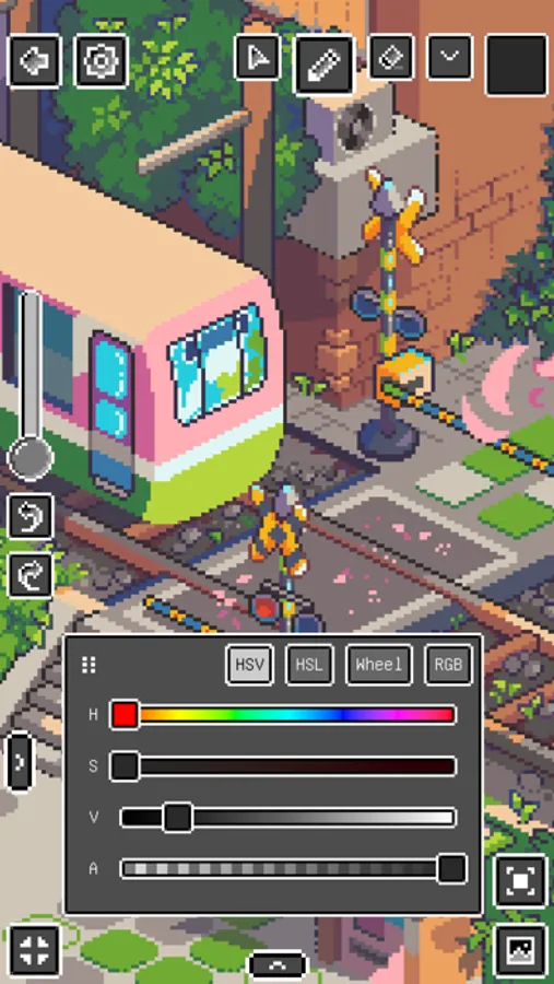 - Color picker: 4 modes (HSV, HSL, Wheel, RGB), history, drag-to-fill
