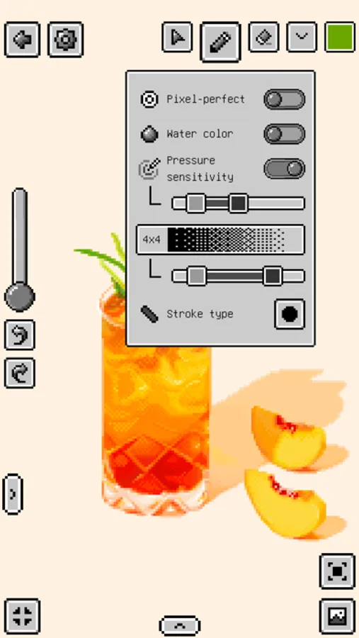 - Eraser: pixel perfect, pressure sensitivity, dithering