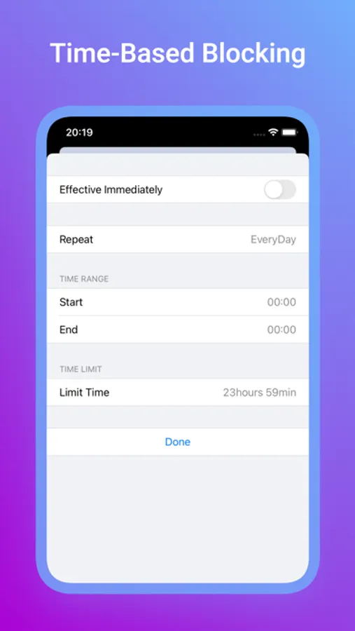 - Time-Based Blocking: Set daily time limits for specific apps in minutes or hours. Once the limit is reached, the app will be blocked until the next day, helping you manage your time on social networks or other time-consuming applications.
