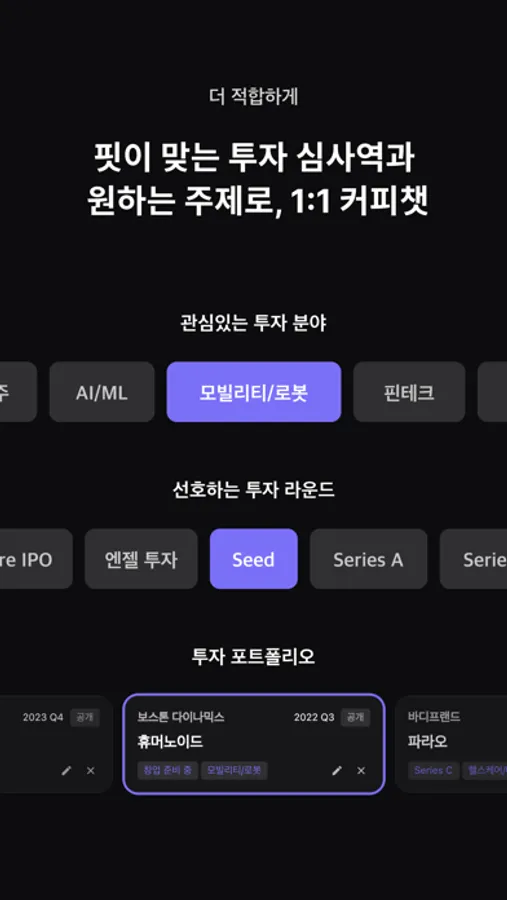 **핏이 맞는 투자 심사역과 1:1로, 원하는 주제로 대화하세요.**