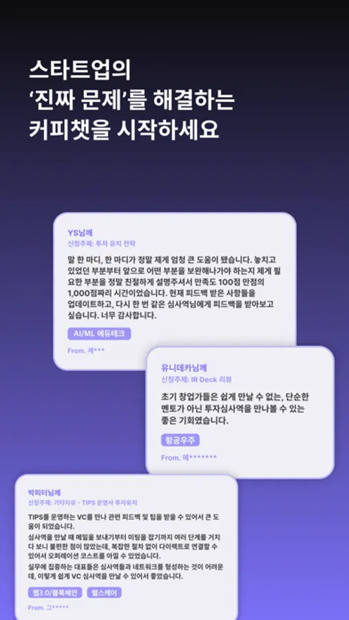 익명성을 보장받는 음성 커피챗을 통한 투자자는 솔직한 피드백은 스타트업의 운영과 성장에 매우 큰 도움이 됩니다.