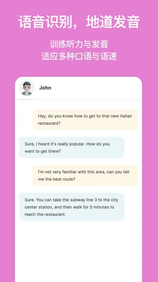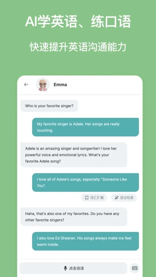 AI学英语,练口语,快速提升英语沟通能力。与智能AI对话,练习各种场景的口语表达,智能对话建议,自动语法检查,加强词汇量,改变您的英语学习体验。