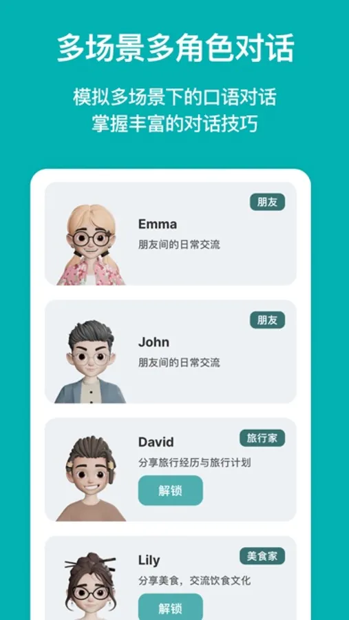 多角色的对话AI,帮助你练习各种场景下的对话表达,随时陪练,帮助你提升表达的自信心。