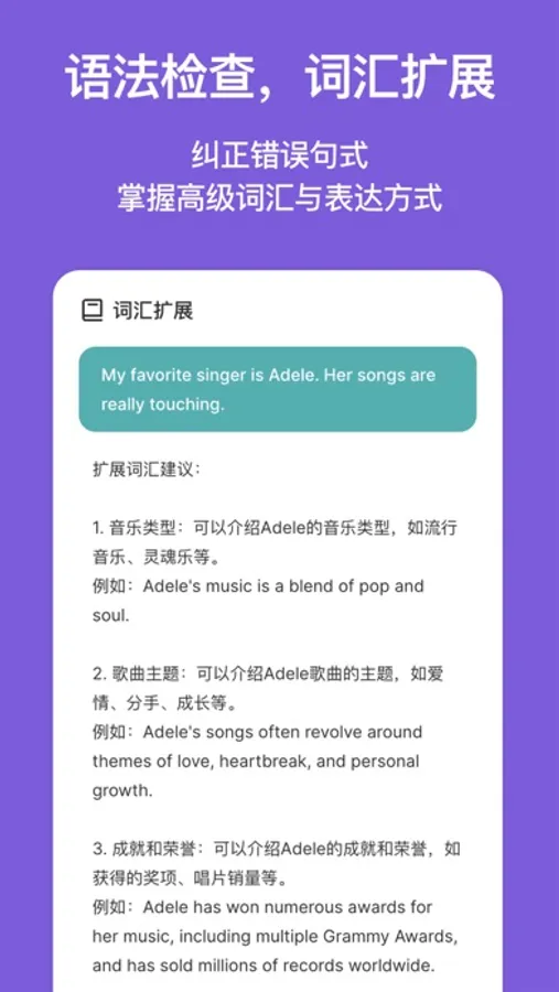 根据你发出的消息,AI将给出一些相关的扩展词汇,让你掌握更高级的词语与表达方式。