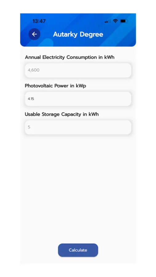 Get the autarky degree, which represents the percentage of independence from the public power grid, through the annual power consumption as well as the performance of the photovoltaic system and the size of the power storage unit.