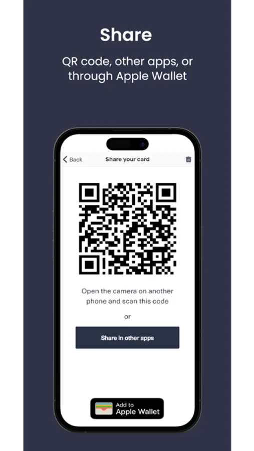 With this app you can share your Bitaqa card with others, either using a QR code, through social media or other apps, or add you can add it to your Apple Wallet.
