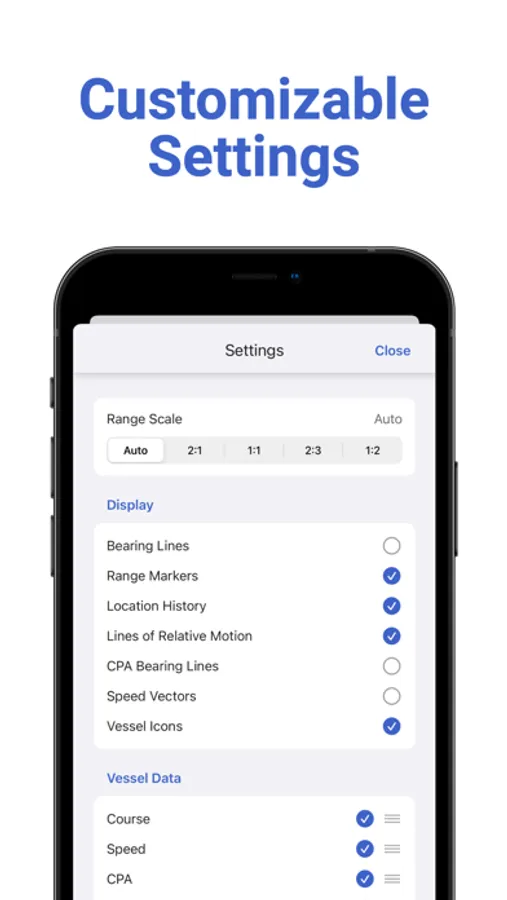 - Detailed Vessel Data: Gather useful information about nearby vessels to include their course, speed, CPA, CPA time, CPA bearing, speed of relative motion, and direction of relative motion.
