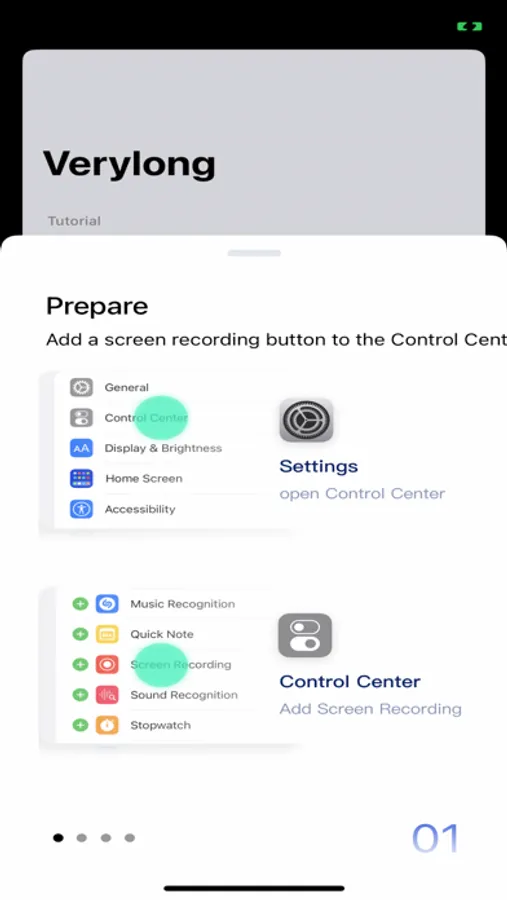 OPEN Settings; select Control Center; ensure the Screen Recording option has been added: