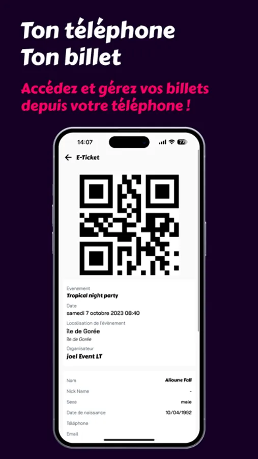 Avec le QR Code de votre ticket disponible dans l’application, présentez votre téléphone et accédez à vos évènements préférés (concerts, after work, expositions, festivals, conférences et bien d’autres). Plus besoin de papier, plus de file d’attente.