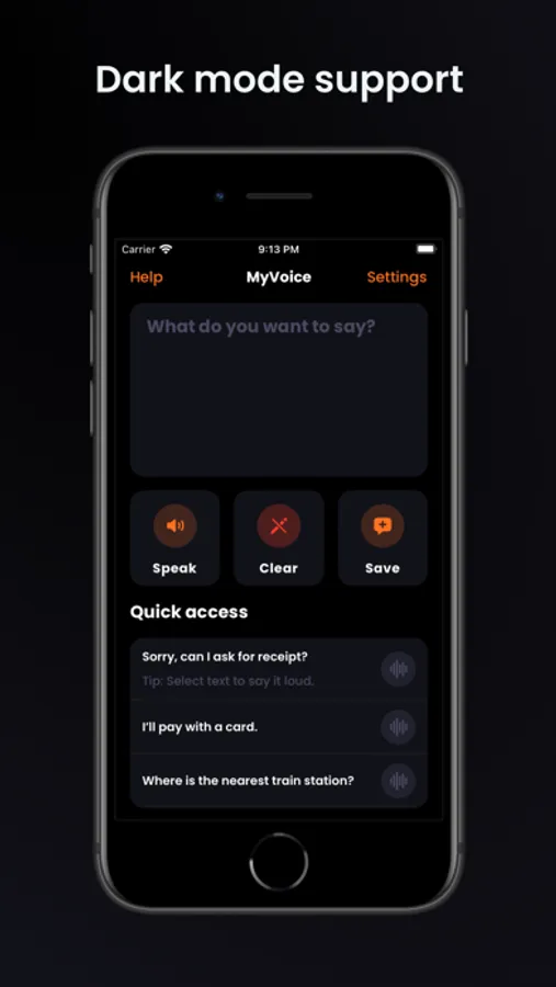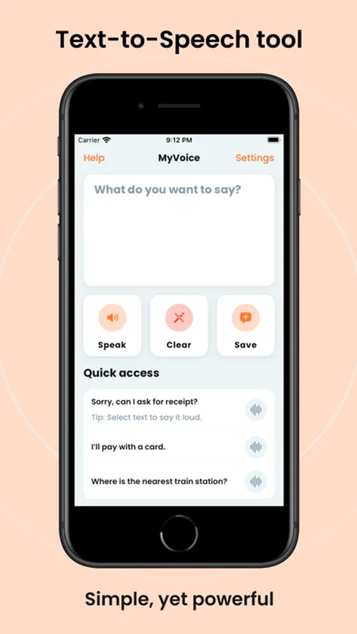▸ Easy-to-Use Interface: MyVoice boasts a sleek and intuitive interface that makes navigation a breeze. Simply enter the text you want to hear and tap Speak. It's that simple.