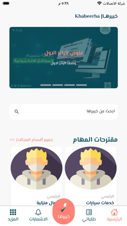 خبيرها ليس فقط لينجز لك مهامك بل هو مساعدك الشخصي في يومك ، إذا كنت تبحث عن استشارات، تصاميم، برمجيات ، تركيب طاولة وكل مهمة أخرى تخطر في بالك ستجد الخبير فيها على مدار الساعة بخدمتك عند تطبيق خبيرها.