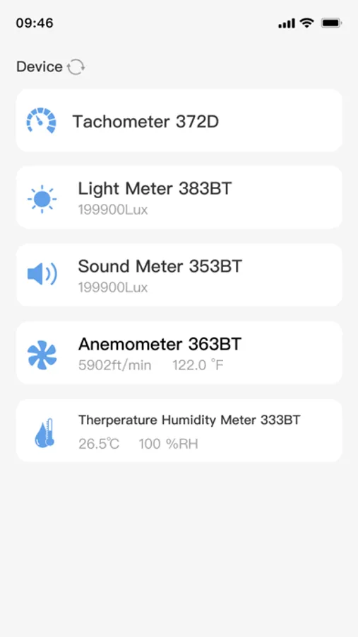 Smart iMeters is a free APP that can be installed on smartphones and connected to the surrounding Therperature Humidity Meter 333BT, Sound Meter 353 BT, Anemometer 363 BT, Light Meter 383 BT and Tachometer 372D via Bluetooth to measure and record temperature and humidity, noise, wind speed, illuminance and rotational velocity in real time.