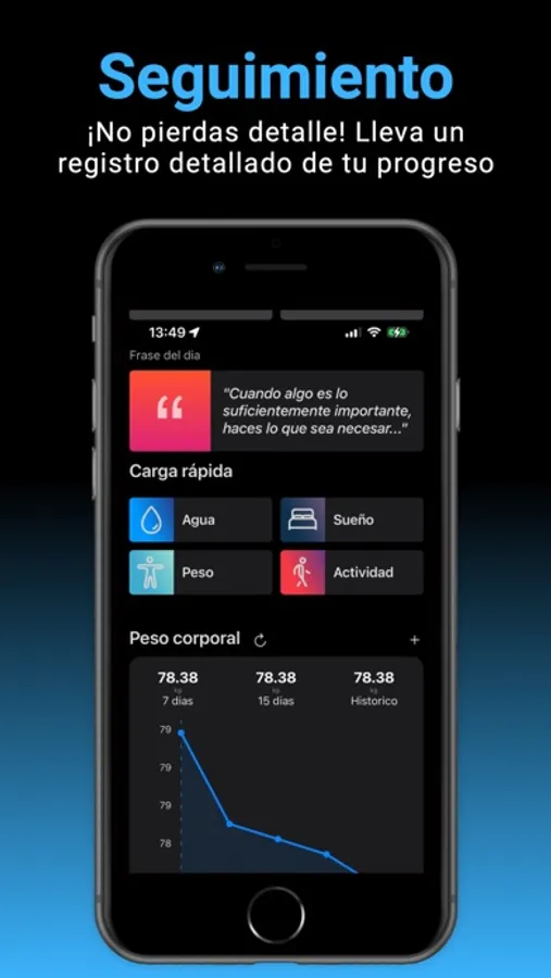 - Registro de peso y medidas corporales: Mantén un seguimiento de tu progreso registrando tu peso y medidas corporales regularmente. Nuestra app te permitirá visualizar gráficos y estadísticas para evaluar tu evolución.