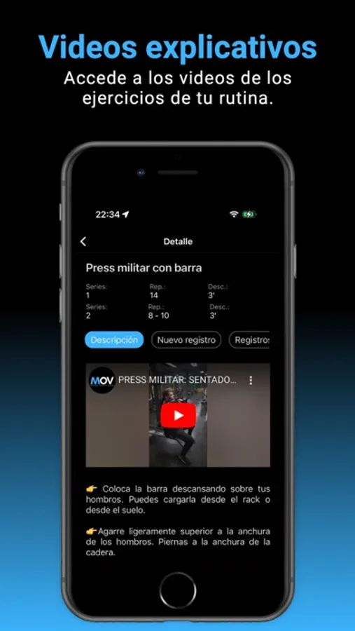 - Registro de entrenamiento: Registra y realiza un seguimiento de tus entrenamientos. Podrás marcar tus repeticiones, series y pesos para llevar un control preciso de tu progreso. Nunca olvides tus registros y mantente motivado con cada sesión de entrenamiento.