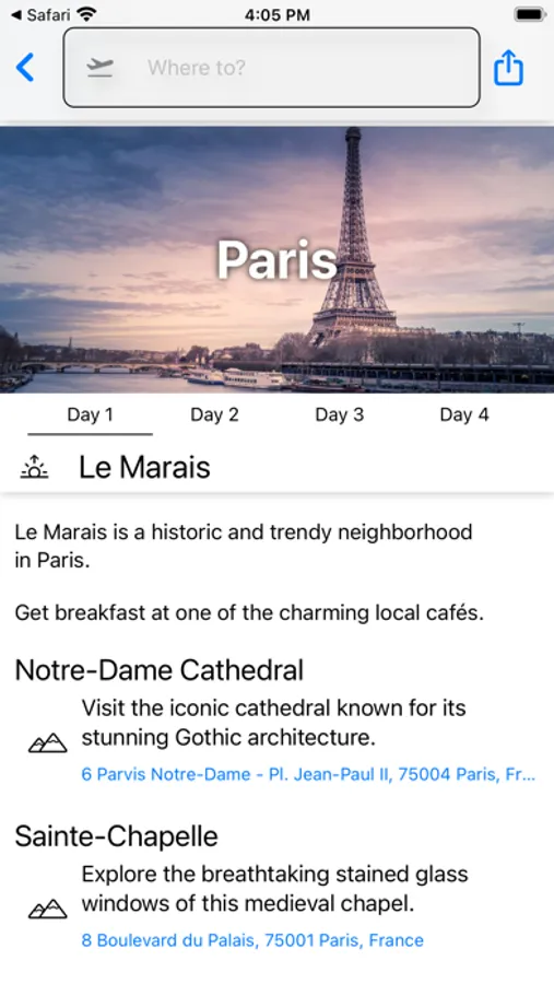 Meet TripIdea - your new best friend for travel planning! Got a location in mind? Awesome, that's all we need to get started. We whip up cool multi-day itineraries to make sure you have a blast at your dream destination.