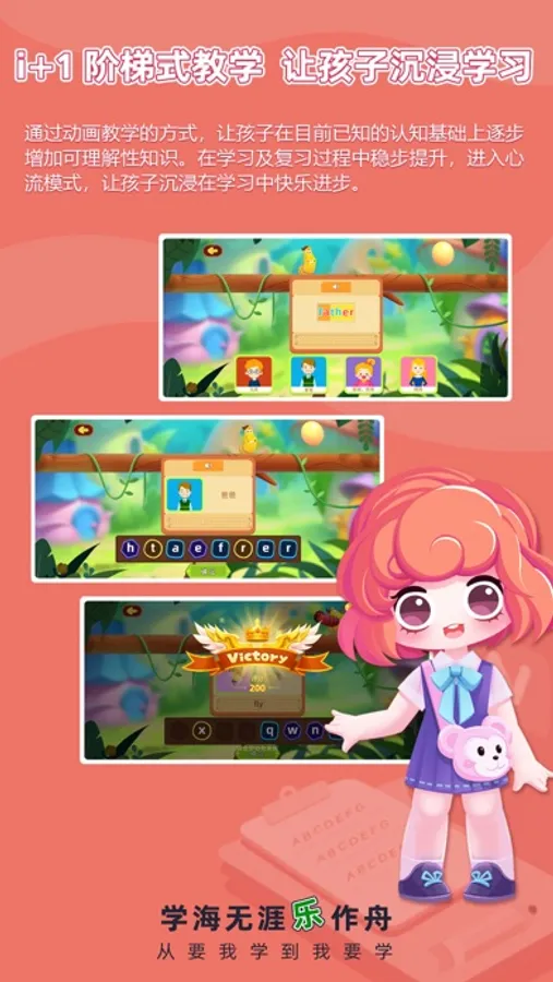 通过动画教学的方式,让孩子在目前已知的认知基础上逐步增加可理解性知识。在学习及复习过程中稳步提升,进入心流模式,让孩子沉浸在学习中快乐进步。