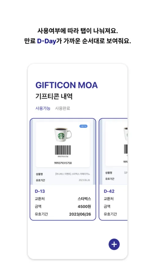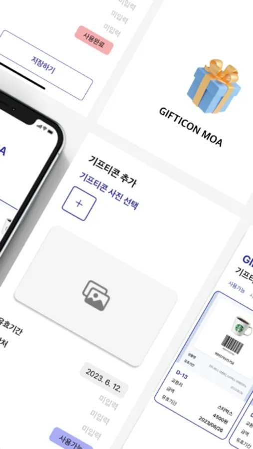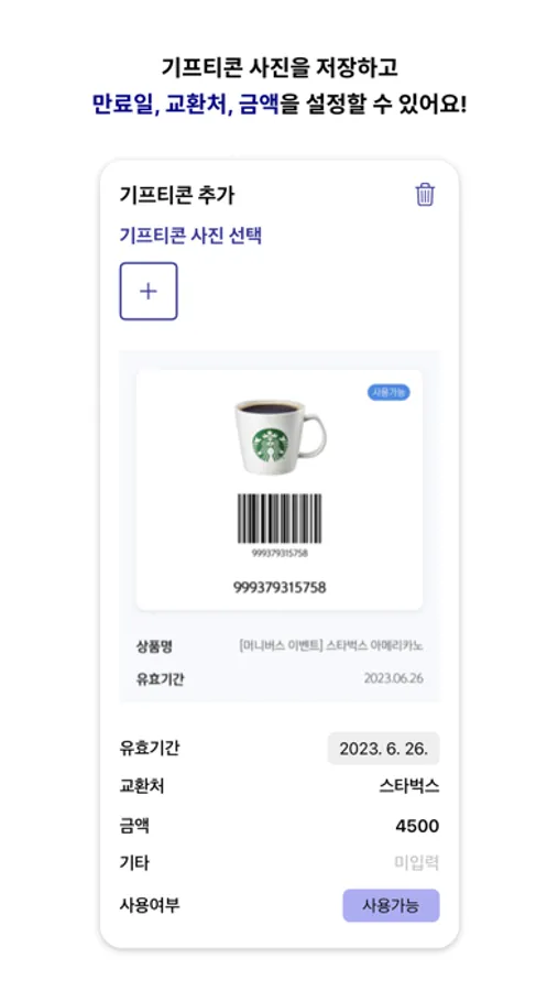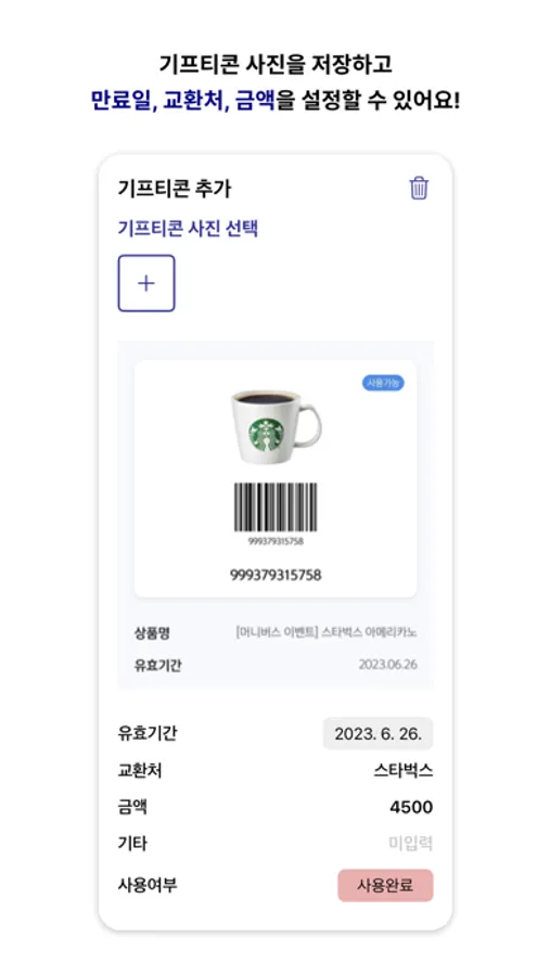 - 기프티콘 이미지(바코드), 유효기간, 교환처, 금액, 사용여부를 저장하고 카드 형식으로 손쉽게 확인할 수 있습니다.