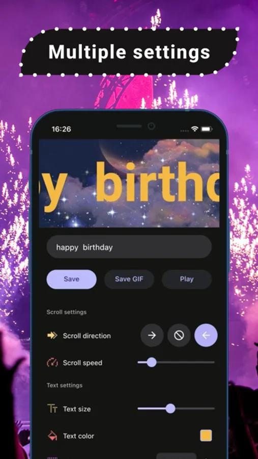With the versatility of this application, you can design patterns that satisfy you. You can choose the font size and color according to your needs. We have a wide selection of font colors, sizes, styles, and tons of fun dynamic backgrounds and color schemes for you to choose from. The direction and speed of text scrolling can also be fully controlLED by you. If you wish, you can make the LED banner blink and adjust the blinking frequency to your liking. Finally, you can add suitable background music to your text for greater presentation. With LED Scroller you have full control over the style of your banner.
