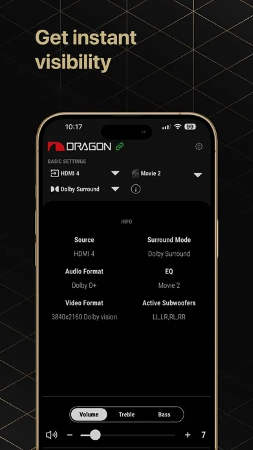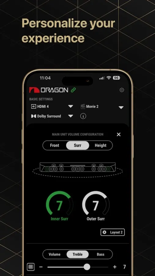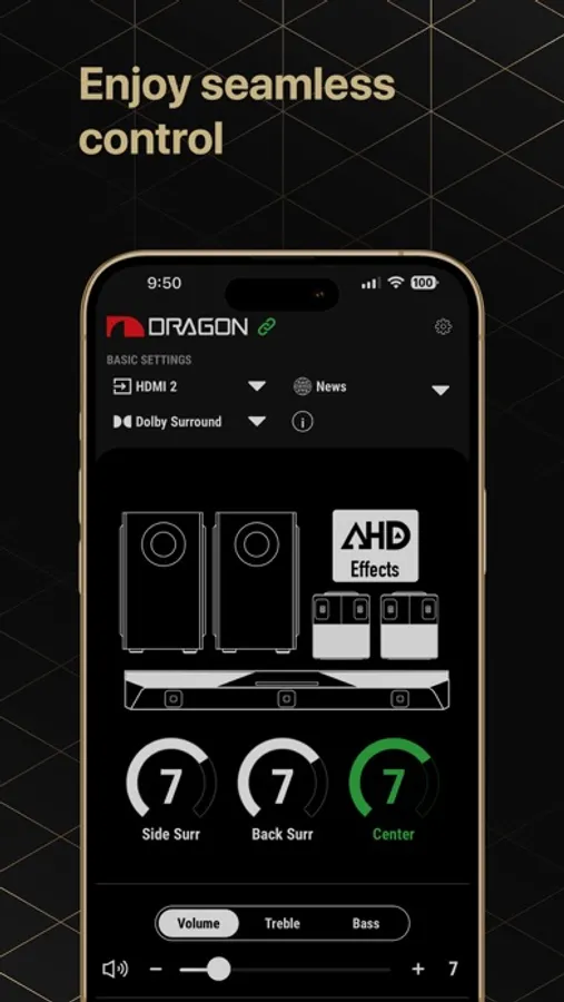 * Personalize your sound experience with just a few taps. Adjust the equalizer, surround mode, individual channel volume levels, and On-Screen Display (OSD) settings to optimize your DRAGON surround experience.