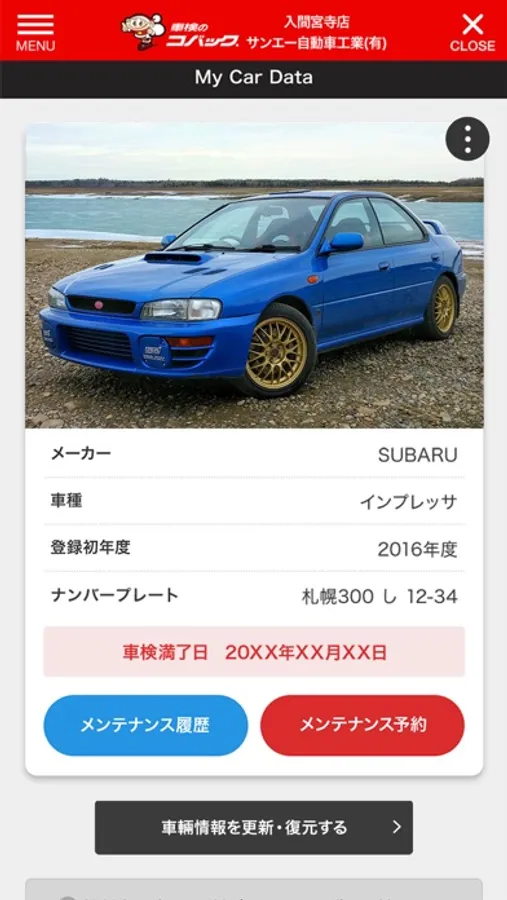 一度店舗へご来店いただきお車の登録がある場合、アプリに必要情報を入力していただくと、ご自身のお車の車検時期などがアプリ上でご確認いただけます!