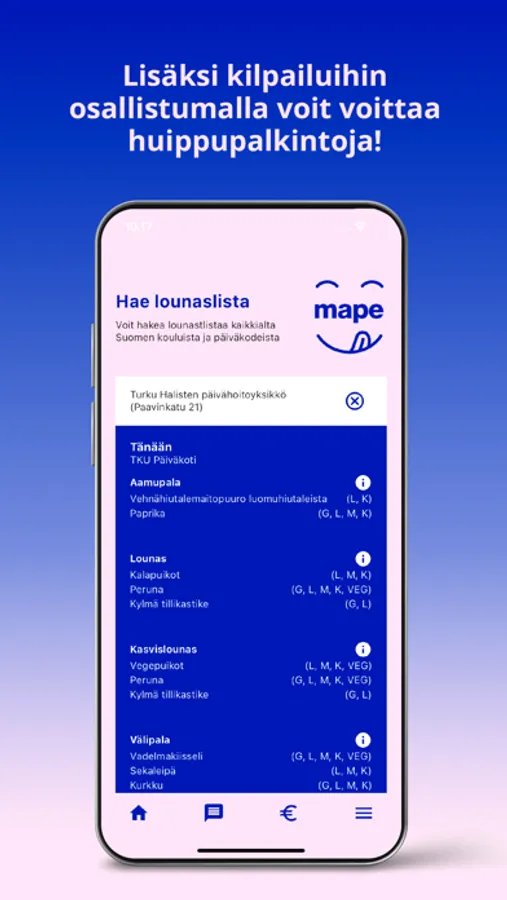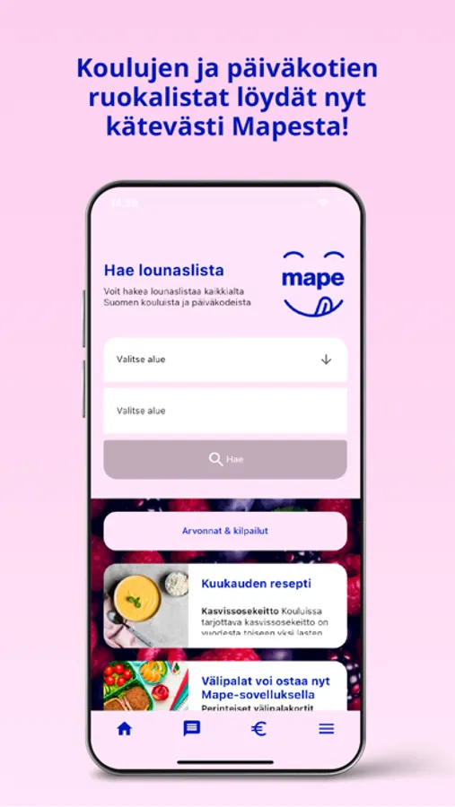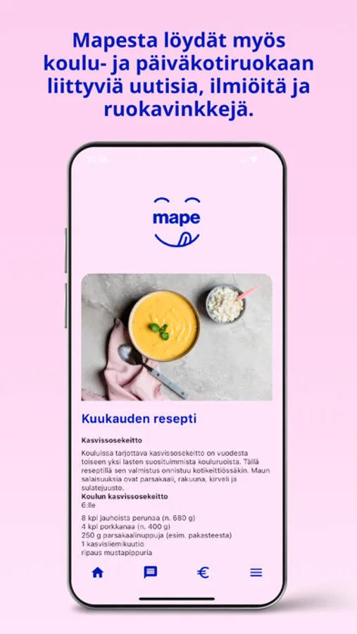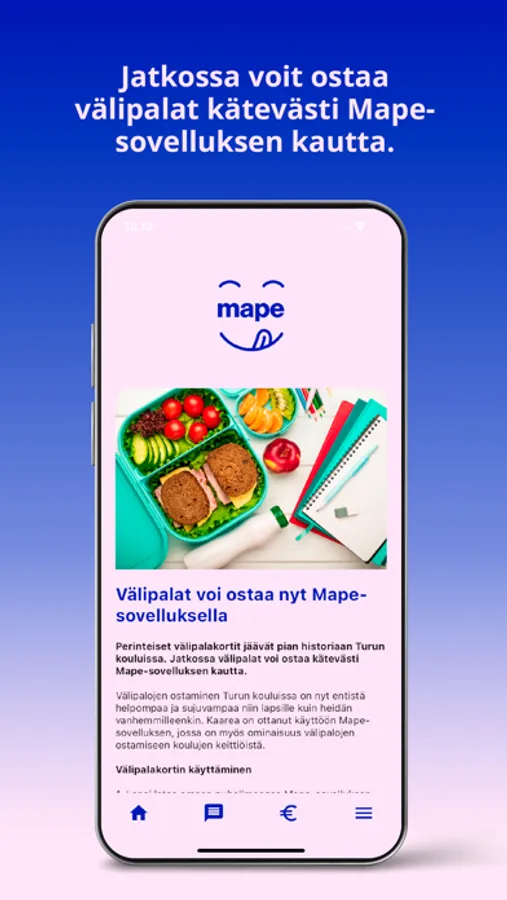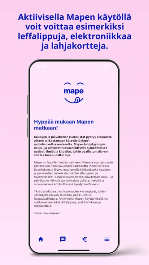 Mape on lapsille, heidän vanhemmilleen sekä koulujen ja päiväkotien henkilökunnalle tarkoitettu kouluruokasovellus. Mapesta löydät koulujen ja päiväkotien reaaliaikaiset ruokalistat, niiden allergeenit ja ravintosisällöt. Lisäksi voit ostaa välipalat kätevästi Mape-sovelluksen kautta. Sovelluksessa voit myös osallistua kilpailuihin ja voittaa kuukausittain huippupalkintoja. Mapesta löydät myös koulu- ja päiväkotiruokaan liittyviä uutisia, ilmiöitä ja ruokavinkkejä kotikeittiöissä hyödynnettäväksi.